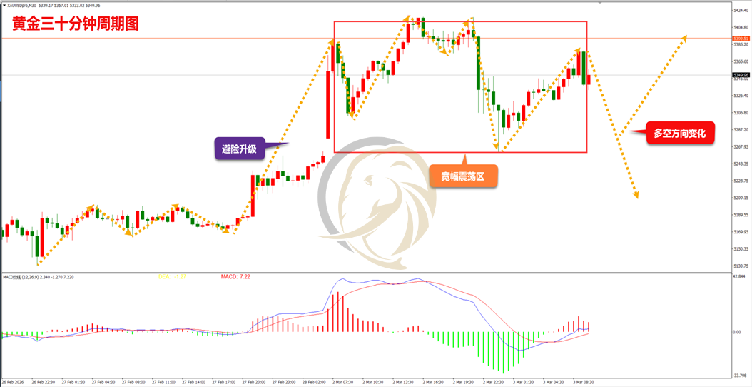 昨日,全球市场出现剧烈波动,在周末美国与以色列对伊朗发动军事打击后,中东地缘政治风险急剧升温,避险资金大举涌入黄金市场,金价早间开始大幅拉升,其后逐步突破5400关口,整体表现相当强势,但晚间高位随着获利盘涌出,空头也出现了快速跳水,高位金价的宽幅震荡让金价多空上窜下跳。当前,美国、以色列和伊朗冲突蔓延至黎巴嫩,金价短线仍有望继续震荡走高,尽管美元和美债收益率大涨令涨幅受到一些限制。