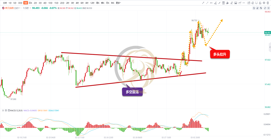 美元指数一小时周期图上,昨日早间多头快速冲高后,空头出现回落调整,短暂下行后迎来多头强力拉升,多头继续创出新的高点。日内早间多空高位蓄势整体,空头回落调整完成后,还有继续冲击新高的可能。