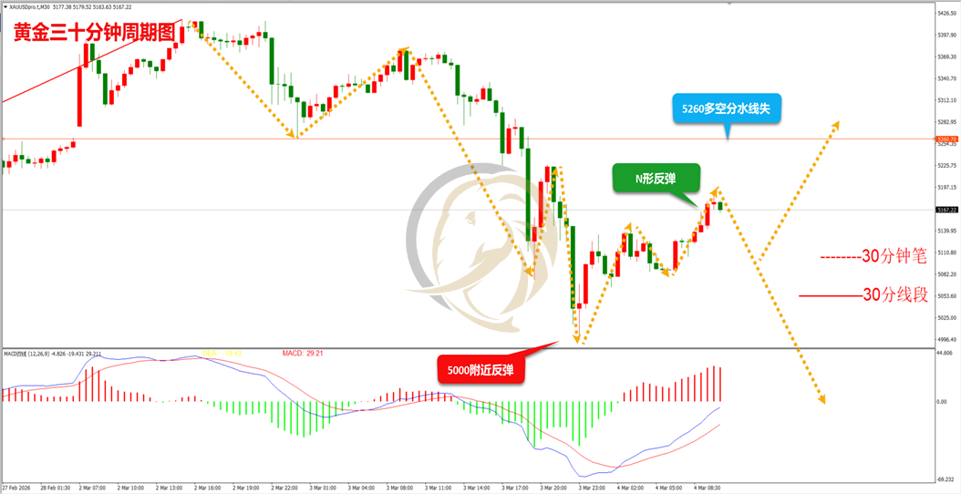 昨日,黄金多头再次上行未能新高,其后空头出现连续跳水,最低下跌至5000附近止跌,其后多头展开强有力反弹。从走势上看,多头高位出现暴跌后,高位已成为敏感区,当前结构上呈现N形反弹结构,因此要留意上行再次受阻后回落。从指标上看,三十分钟周期图MACD指标快慢线DIFF和DEA在0轴下方金叉运行,红色动能柱还在生长,多头反弹还进行中,操作上建议回落做多的思路进行操作。