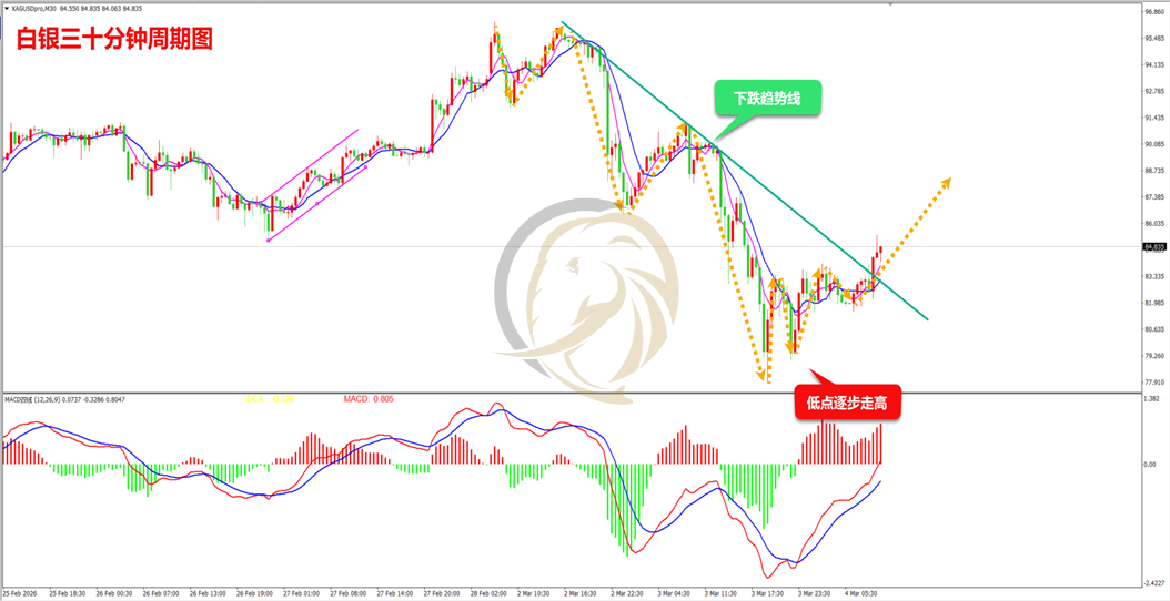 昨日,白银多头早间短暂反弹后,空头开始破位下行,晚间最低下跌至77.900附近,其后多头展开反弹。从走势上看,空头高位暴跌后,多头展开反弹,且高低点正在抬高,日内要留意多头继续走高。从指标上看,三十分钟MACD指标快慢线DIFF和DEA在0轴上方运行,红色动能柱还在生长,操作上建议做多的思路进行操作。