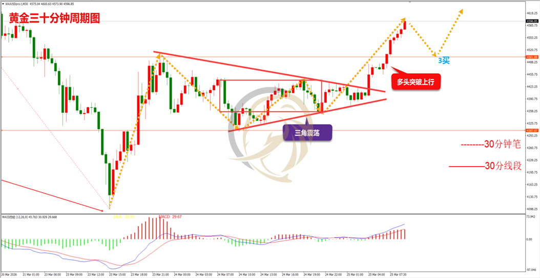 昨日,黄金多空持续震荡运行,晚间美盘时段空头再次冲高回落,其后出现突破上行,日内早间持续大涨。从走势上看,多头低位V反后,多空处在三角区间震荡,其后多头再次冲高,日内回落后将出现三买机会,其后有继续上行的可能。从指标上看,三十分钟周期图MACD指标快慢线DIFF和DEA在0轴上方金叉运行,红色动能柱有缩短现象,操作上建议回落做多的思路进行操作。