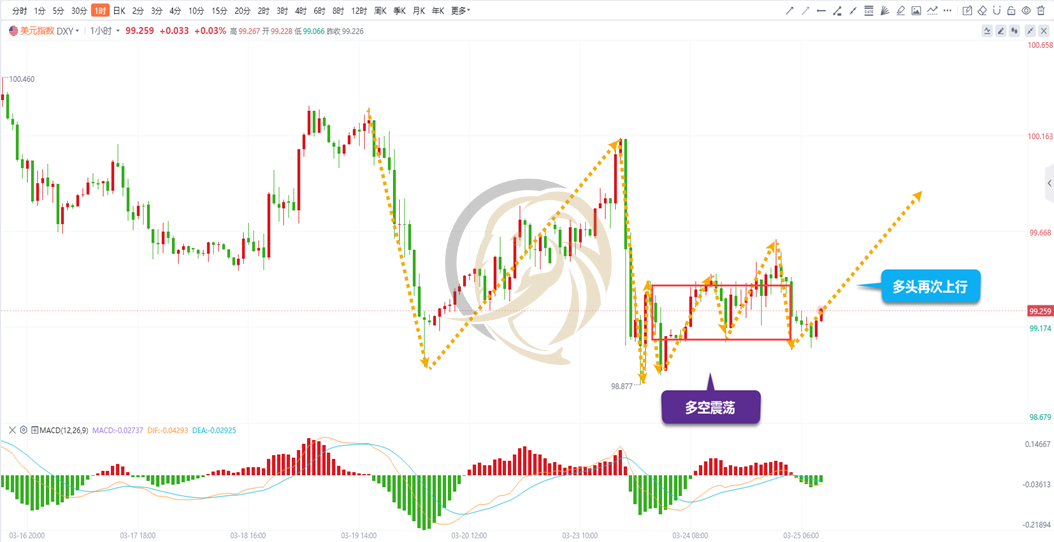 美元指数一小时周期图上,昨日多空持续震荡上地,N形反弹后出现空头继续回落,但从早间表现来看,下跌已经出现止跌,日内多头有继续上行的可能,由于当前多空还处在下降中的震荡,因此还是要留意冲高后的回落。