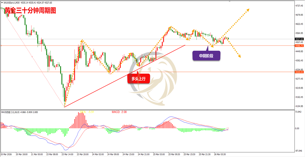 昨日,黄金多头早间突破上行,其后空头出现回落整理,晚间美盘时段继续走弱。从走势上看,多头上行趋势结构形成,但当前面临进入中阴阶段,多空又处在方向选择,由于多头依然有上行可能,还要留意继续走高,从指标上看,三十分钟周期图MACD指标快慢线DIFF和DEA在0轴金叉运行,红色动能柱开始生长,操作上建议做多的思路进行操作。