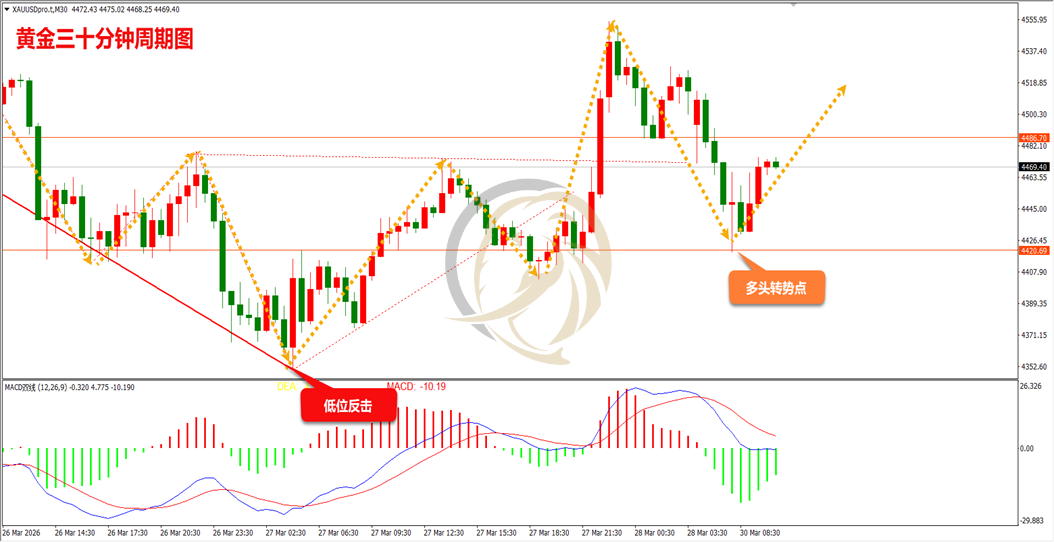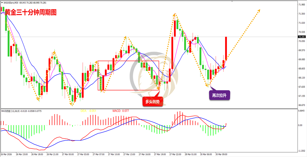 上周五,黄金多头完成回落调整后,多头持续上行,晚间美盘时段出现快速拉升,日内早间完成回落后有继续上行之势。从走势上看,多头上升趋势正在转势中,早间回落完成后,低位底分型属于标准转势力点,日内要留意多头的大幅走高。从指标上看,三十分钟周期图MACD指标快慢线DIFF和DEA正在回抽0轴附近,红色动能柱逐步缩短,操作上建议做多的思路进行操作。