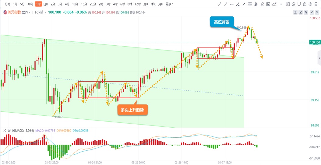 美元指数一小时周期图上,多头上升趋势持续运行,早间冲高后出现背弛,其后空头回落调整。从走势上看,多头上行趋势出现背弛转折期,要留意新的方向出现。从指标上看,MACD指标快慢线DIFF及DEA已经死叉,空头动能柱 正在释放,回落正在进行中。