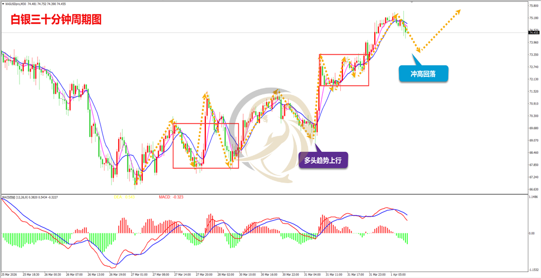 昨日,白银多头早间快速拉升,其后调整后继续震荡上行,日内早间拉升至75附近,多头整体表现非常之强。从走势上看,多头上升趋势还在延续,早间高位回落还在进行中,下方73.400一带为支撑线,短暂回落后要留意多头再次上行。从指标上看,三十分钟MACD指标快慢线DIFF和DEA在0轴上方死叉运行,绿色动能柱还在生长,操作上建议回落做多思路进行操作。