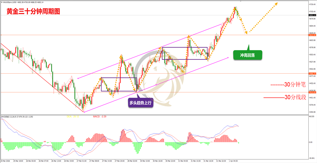 昨日,黄金多头早间快速拉升,其后出现一波调整,止跌后多头继续展开强有力上行,日内早间已冲击至4700。从走势上看,多头上升趋势还在保持,早间快速冲高后调整开始出现,下方4622一带为支撑带,要留意回落结束后的再次上行。从指标上看,三十分钟周期图MACD指标快慢线DIFF和DEA正在回抽0轴上方死叉中,绿色动能柱还在生长,调整还在继续,操作上建议回落继续做多的思路进行操作。