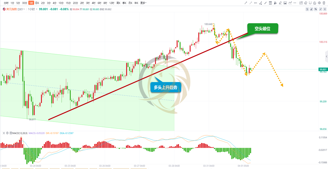 美元指数一小时周期图上,昨日多头再次上行未能新高,其后空头出现破位下行,全天大幅回落。从走势上看,多头上升通道已出现破坏,连续下跌后下方动能柱持续缩短,日内要留意多头反弹出现。