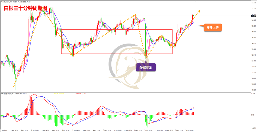 昨日,白银快速回落后,多头展开反弹,晚间二次回落后出现止跌,其后再次上行出现修复。从走势上看,多空处在高位大型箱体内,日内多头有继续冲击新高的可能,要也要留意受阻后可能出现的回落。从指标上看,三十分钟MACD指标快慢线DIFF和DEA在0轴上方运行,红色动能柱还生长,但二次上升有一定缩短,要留意高位有调整,操作上建议高位做空思路进行操作。