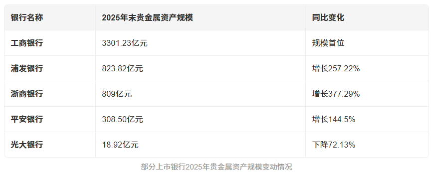 2025年末,上市银行贵金属资产全面扩张,头部效应与成长性兼具。工商银行以3301.23亿元稳居首位,中、农、建三大行均突破千亿元。股份制银行表现突出,浙商银行资产规模同比激增377.29%,浦发、平安银行增幅分别达257.22%和144.5%。虽光大银行等少数机构收缩业务,但行业整体规模与利润贡献居历史高位,实物及积存金业务是银行增收核心。