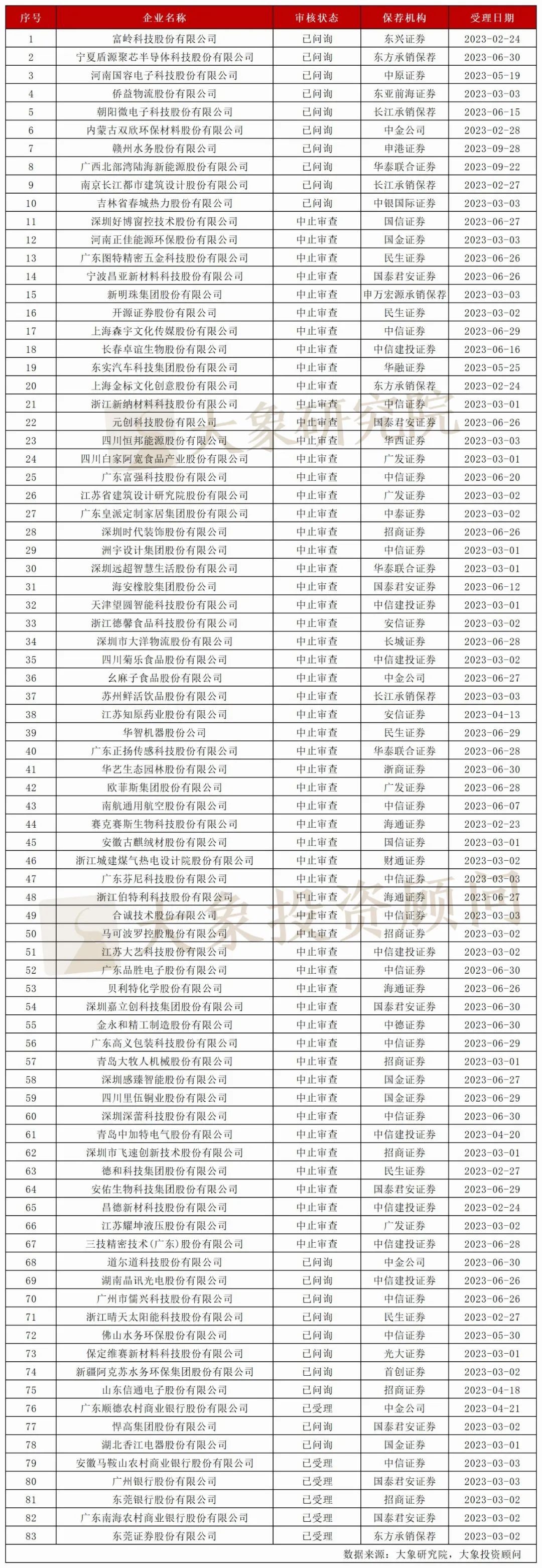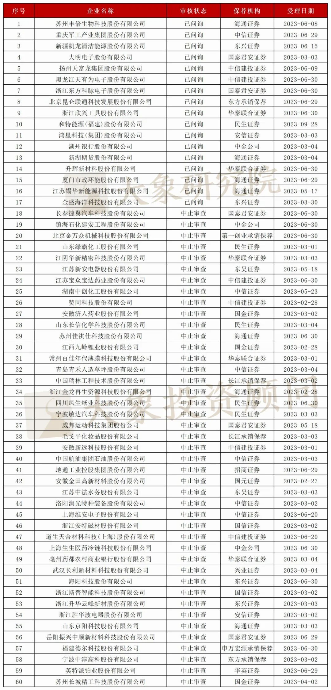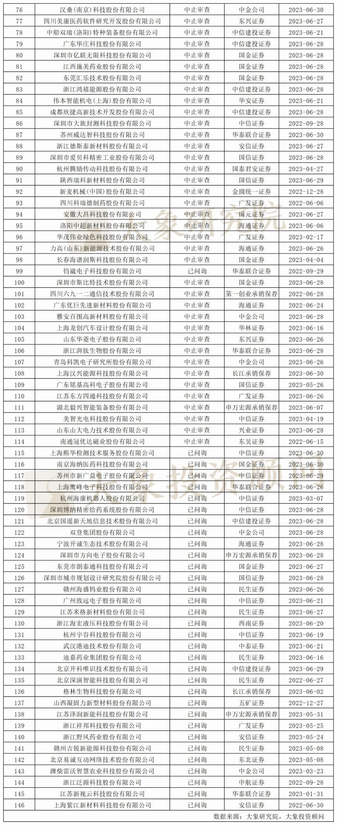 据大象君统计,按排队企业状态来看,中止企业有311家,占比57.17%。