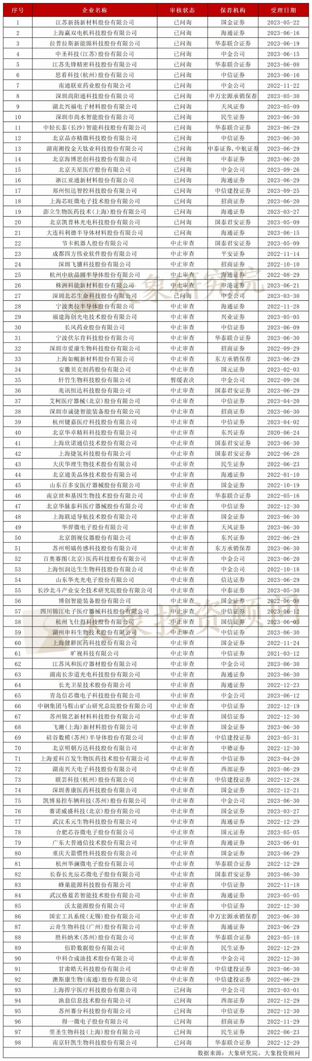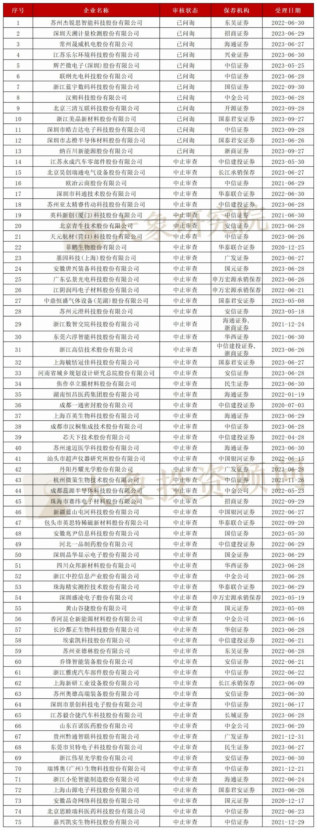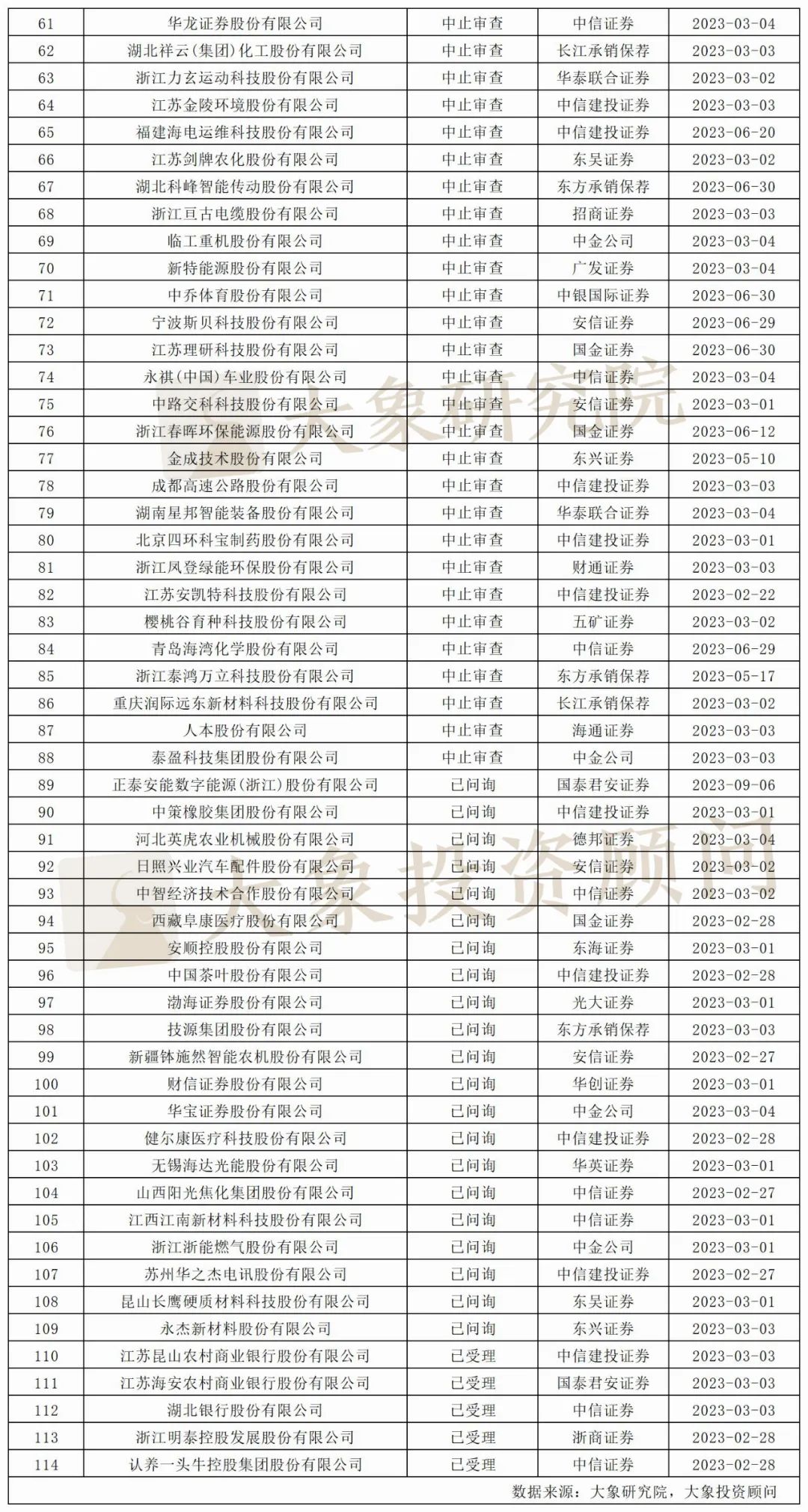 据大象君统计,按排队企业状态来看,中止企业有311家,占比57.17%。