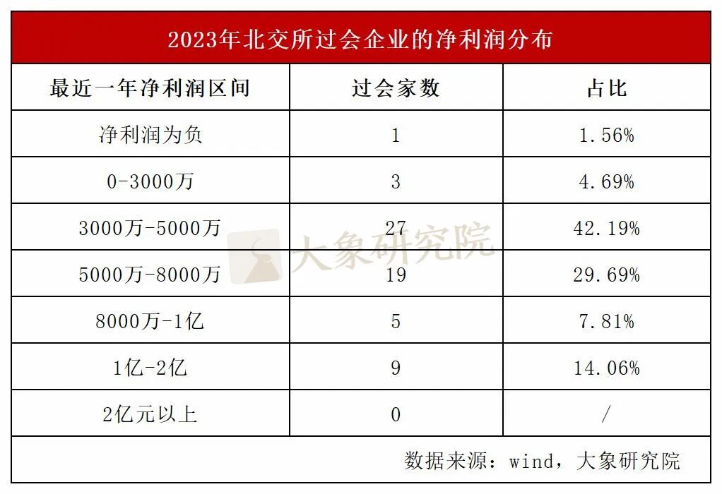 在北交所过会企业中,有1家过会企业最近一年净利润为负,占比1.56%。