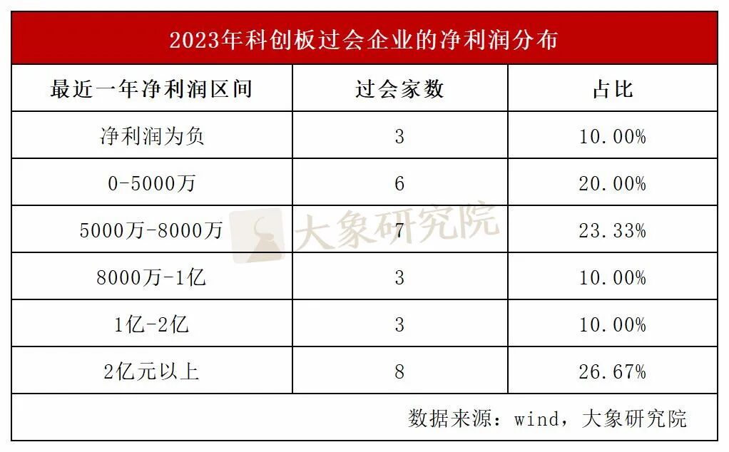 在披露2022年净利润年报的273家上会企业中,科创板上会32家企业,占比11.7%,其中过会企业30家,被否1家,暂缓1家。科创板过会企业最近一年的平均净利润为2.29亿元,净利润中位数为7298.03万元,净利润小于5000万且为正有6家,占比20%,净利润最高值为30.09亿元,最低值为-2.71亿元。