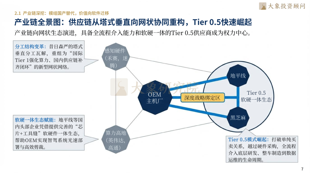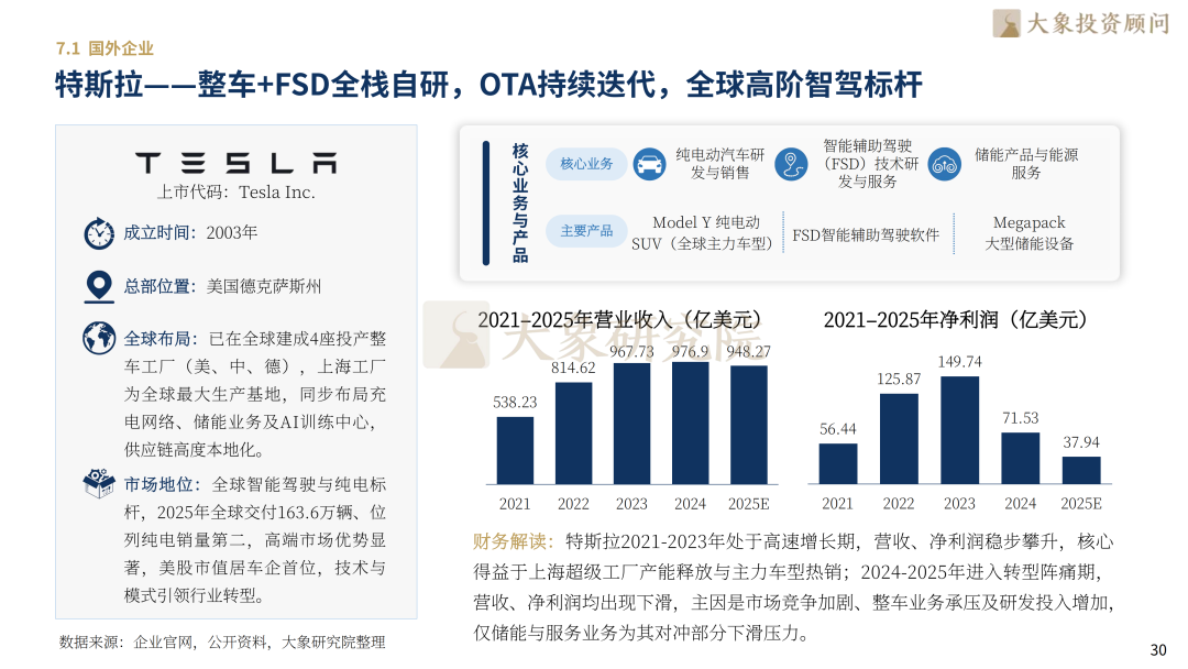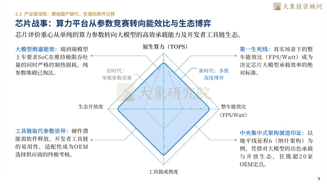 中国智驾市场正释放惊人增长势能,预计2030年中国智驾市场规模将突破5万亿元。中国特有的高频无保护左转、人车混行等复杂路况,为端到端算法提供了全球最严苛的“极限训练素材”,加速了长尾场景(Corner Case)的收敛。与此同时,B端商业模式已触及盈利红利区,以百度萝卜快跑为例,其总订单已超1,700万单,单公里分摊成本随接管率趋零而大幅降低。 价值链重心正从硬件制造向数据闭环与算法迭代转移。具备全流程介入能力的“Tier 0.5”供应商成为权力中心,打破了传统的塔式供应关系。芯片评价标准已从单纯的算力参数转向“整车能效比(FPS/Watt)”与生态开放度。在20-30万价位区间,L2++装载率自24Q1起呈指数级攀升,硬件预埋已成为抢占高阶智驾心智的“必买门票”。 智驾格局正呈现极度收敛,行业前十(CR10)的市场份额已由2019年的64.1%提升至2024年的77.9%。领军者凭借“PB级数据+超大规模算力”构建了后发者无法逾越的物理防御。特斯拉智算中心规模已达100 EFLOPS(约30万块A100),其模型自演化飞轮正快速拉开代差。缺乏全栈自研能力的尾部玩家正面临技术栈被代际跨越“清零”的风险。 车企利润结构正经历翻天覆地的演变。到2030年,高阶智驾软件及服务的市场贡献占比预计将达99.1%,彻底重构车企估值体系。依托高频通勤场景建立的用户粘性,智驾订阅渗透率将呈S型增长,预计2035年智能驾驶渗透率将达到30%-50%。通过OTA持续唤醒存量资产价值,车企正从单纯的“卖车”向“全生命周期服务”转型。 2026年,智驾赛道已形成“全栈自研派”与“生态协同派”的双极格局。特斯拉凭借100 EFLOPS的总算力池与13亿英里的真实路测里程,构筑了后发者无法逾越的物理壁垒。与此同时,国内芯片标杆如地平线已狂揽超20家OEM定点,覆盖百余款量产车型,通过极致灵活的“Tier 0.5”模式在中低端市场实现规模突围。报告显示,禾赛科技在2025年以近50%的全球车载激光雷达市占率持续领跑,成为首家实现年产量破百万台的盈利企业,标志着中国供应链已掌握全球智驾底层硬件的话语权。