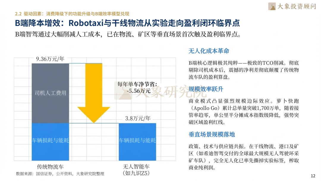 大象投顾依托深厚的行业研究积淀,精准前瞻智驾产业赛道,聚焦端到端大模型、智算中心及车路云一体化等前沿趋势。报告通过拆解特斯拉、地平线及传统OEM的差异化路径,穿透算力鸿沟、数据主权与成本控制等关键瓶颈,厘清B端Robotaxi盈利临界点与C端订阅渗透规律,为产业企业与投资机构提供兼具前瞻性与实操性的决策参考。