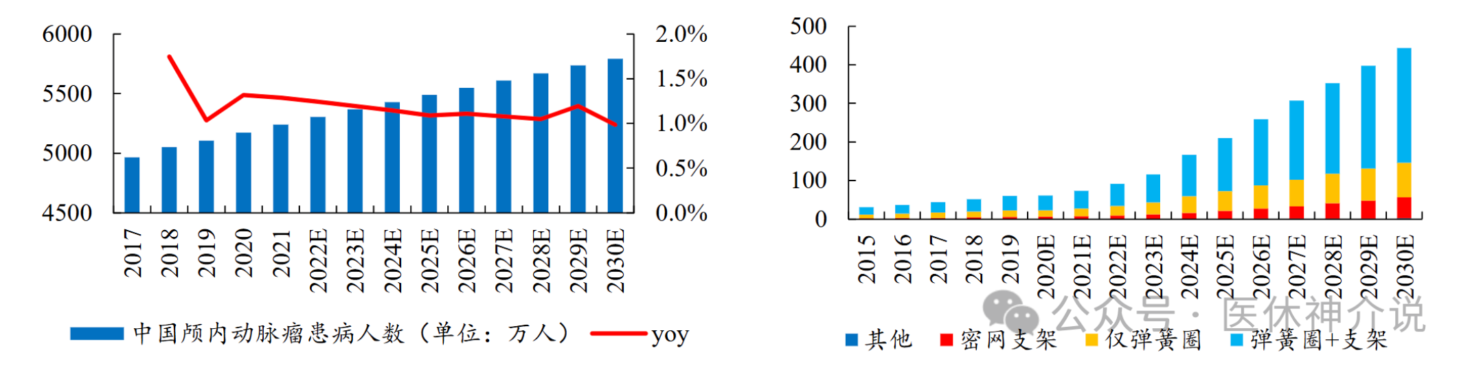 脑动脉瘤危险性极高,异常瘤体占位效应可导致偏瘫、昏迷、死亡等,如不及时干预动脉瘤破裂可致脑出血和死亡,且脑动脉瘤发病率极高。据医休器械调研数据:2024年中国颅内动脉瘤介入手术约10万台。