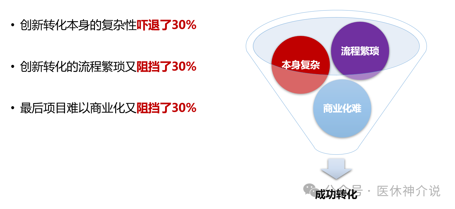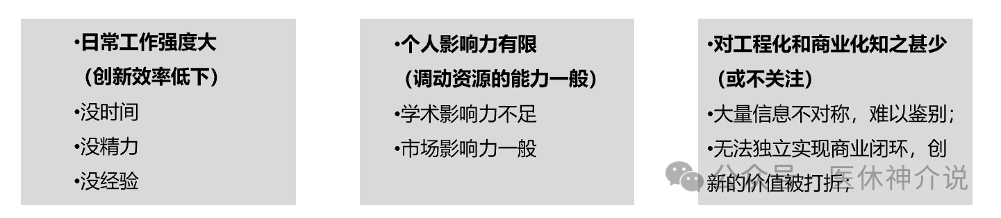 大多数临床医生和临床科研人员因为受自身能力结构限制,加上本职工作任务过重,导致商业化能力和精力都有所缺乏。