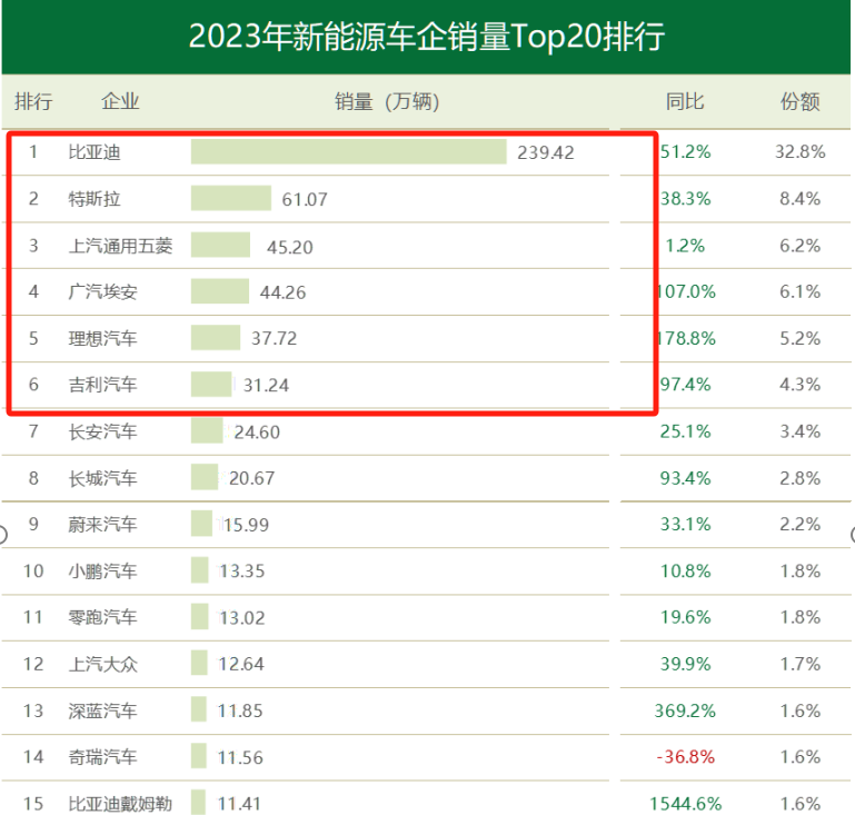 因为整个市场需求已经被填满了。如果按照车聚网整理的这个数据,目前年销量新能源汽车30万辆以上的有比亚迪、特斯拉、上汽通用五菱、理想、吉利6家。