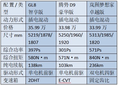 表:GL8插混、腾势D9、岚图梦想家主要配置对比