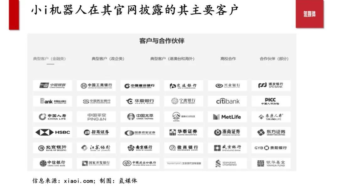 在CIAI的核心技术平台之上,小i机器人为客户提供基于六大核心技术的服务,包括:自然语言处理、计算机视觉、机器学习、情感计算、语音处理、数据智能和超级自动化。而在核心技术之上,其产品主要是为包括金融机构、政府机构等在内的客户提供智能AI语音客户服务,截止目前,根据氢媒体的观察,其产品相对单一,客户集中在国内,且客户所在行业相对集中在金融行业。