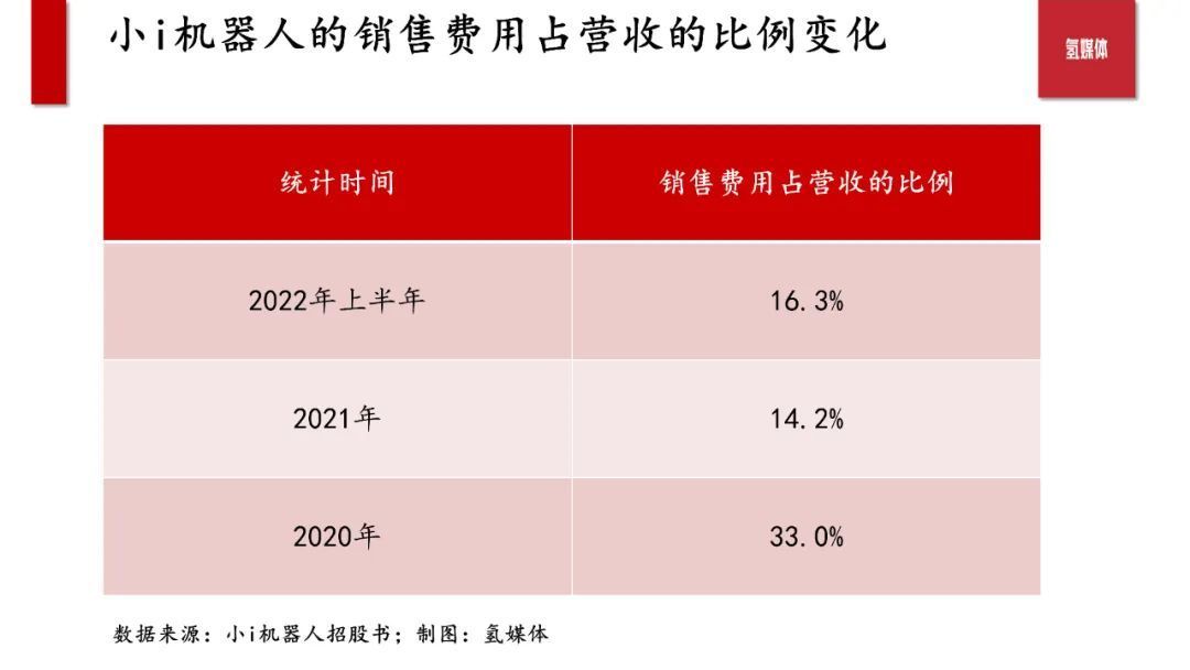 但据氢媒体调研,小i机器人的销售费用效率在衰减,即每一美元的销售支出产生新营业收入增长,从2021年的4美元降低到了2022年上半年的1.9美元,显示小i机器人的销售效率遇到瓶颈。