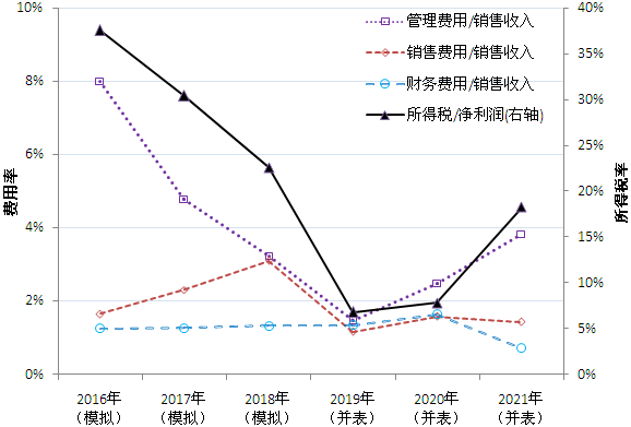 图15 2016年到2021年闻泰科技费用率及所得税率走势