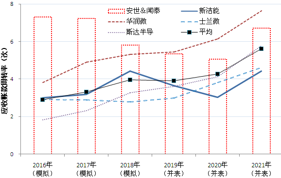 图18 2016年到2021年闻泰科技与同行业A股上市公司应收账款周转率对比