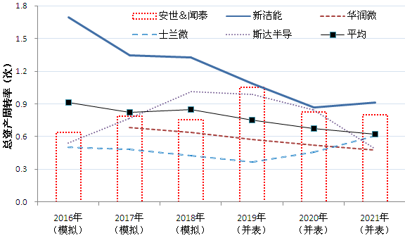 图16 2016年到2021年闻泰科技与同行业A股上市公司总资产周转率对比