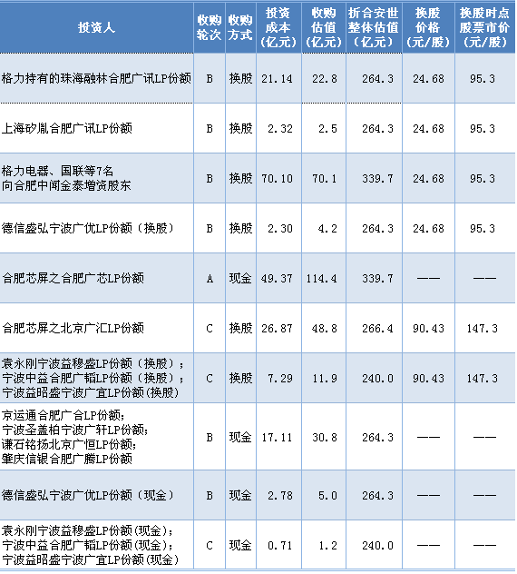 在不同收购轮次、不同交易安排下的投资人,其分享的收购溢价、并表溢价及协同溢价比例是有差异的,因此各自的投资收益率自然也高低各不相同。合肥芯屏在第一次收购交易中获得了较高的收购溢价,但由于是现金收购,因而不能享受并表溢价及协同溢价。在第三次收购交易中,合肥芯屏接受了换股收购,但也仅享受了部分协同溢价,分享不到并表新增市值收益。当然这是并购交易的整体安排,大部分投资人可能只是被动接受这种安排。