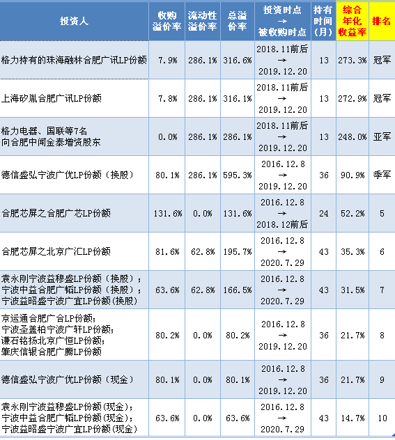 下面我们计算并点评一下本并购交易中各投资人(基本上都是有限合伙制私募股权基金及战略投资人)的收益率情况。