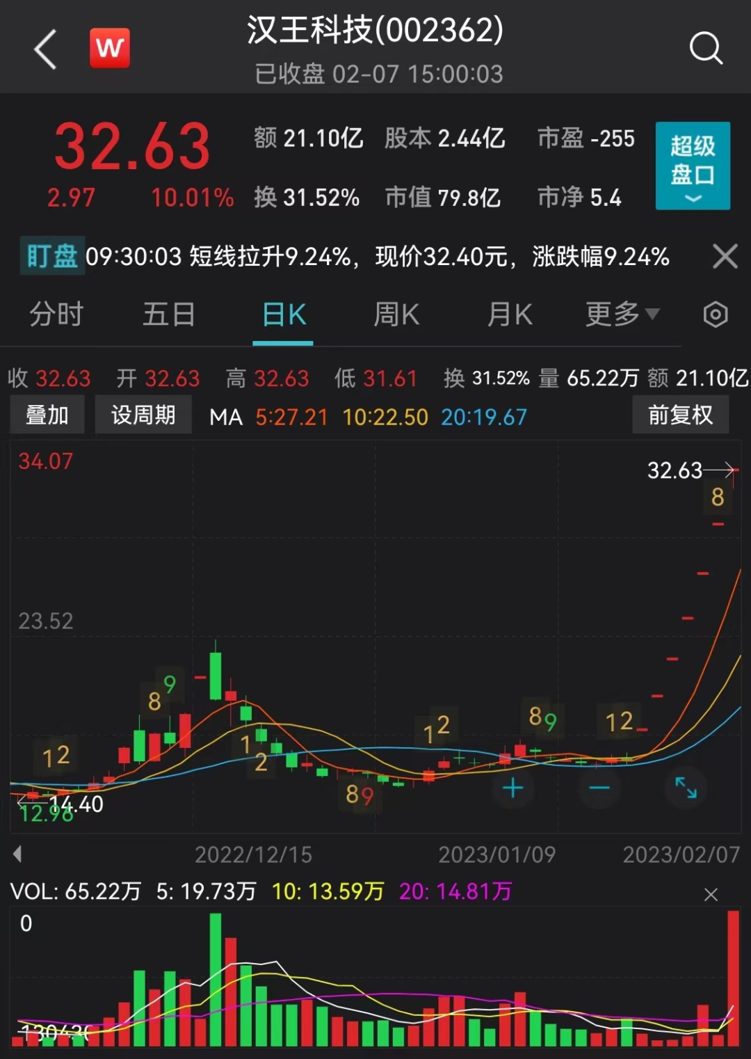 2月7日开盘,汉王科技再次一字涨停,拿下自1月30日(兔年首个交易日)股价上涨启动以来的“七连板”。同于1月30日启动涨幅的云从科技、初灵信息和福石控股,截至2月7日收盘累计涨幅分别超过90%、70%和50%。