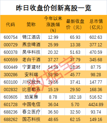 从股价表现看,收盘创历史新高股中,昨日股价平均上涨3.77%,涨停的有宁夏建材等,涨幅居前的有中国电信、国芯科技、春立医疗等。股价方面,超百元的有1只,50元至100元的有3只。收盘股价最高的是珀莱雅,昨日收盘价为182.18元,上涨1.23%,其次是锦江酒店、国芯科技,收盘价分别为65.93元、62.15元。
