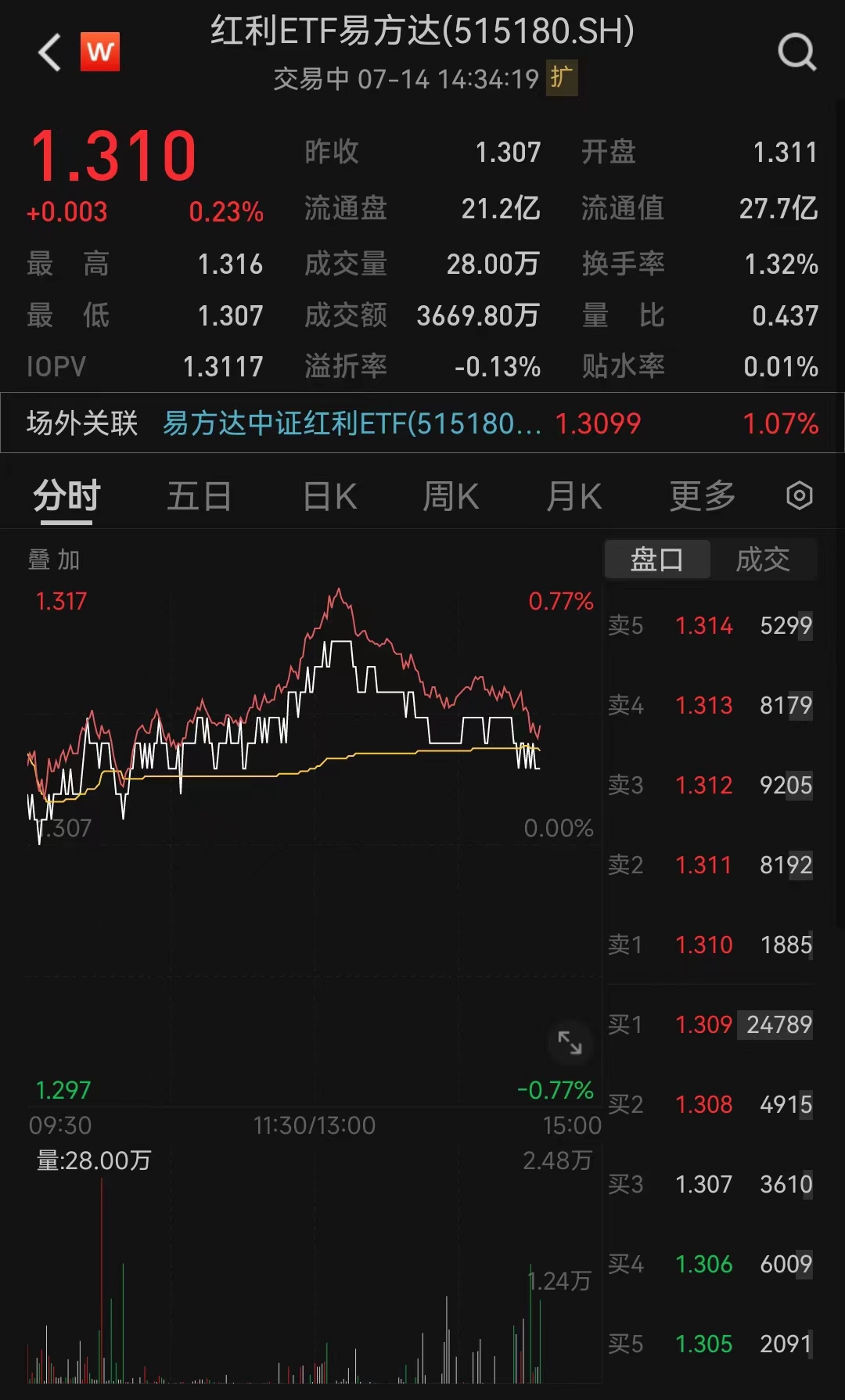 上交所数据显示,截至7月13日,红利ETF易方达(515180)最新基金份额为211563.70万份,基金规模超27亿,是目前市场上跟踪中证红利指数规模最大的ETF。