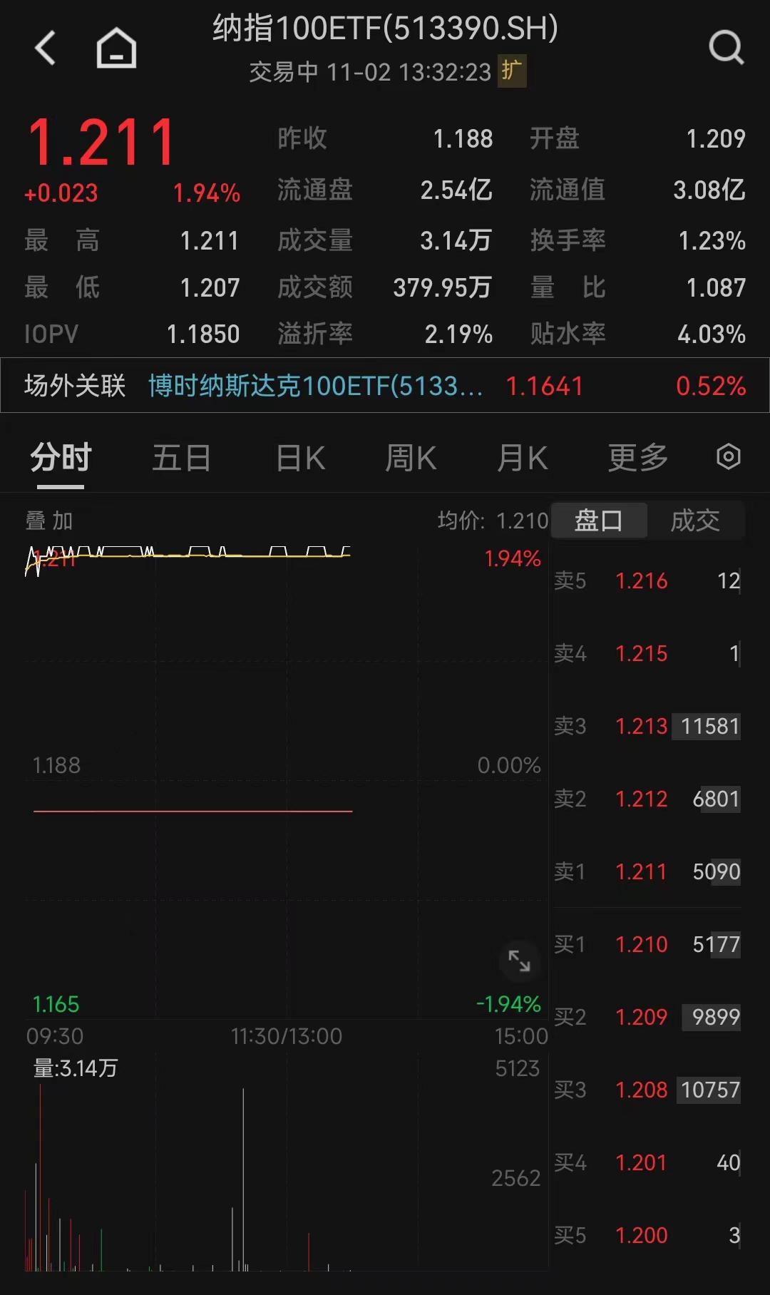 截至13点32分,纳指100ETF(513390)1.94%;重仓股全线飘红,英伟达涨3.79%、Meta涨3.51%、亚马逊涨2.94%、特斯拉、微软、谷歌A等跟涨;该基金此前已连涨4天。