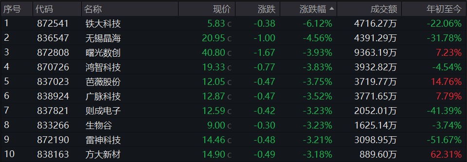北证A股今日跌幅TOP5分别为:铁大科技、无锡晶海、曙光数创、鸿智科技、芭薇股份。