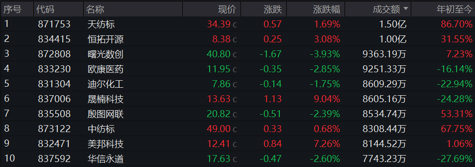 个股成交额方面,今日北交所有2只个股成交额≥1亿元,分别为:天纺标、恒拓开源。