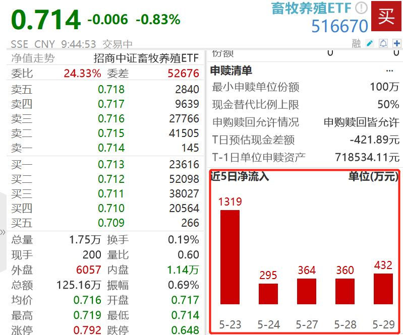 在近期板块调整过程中,资金持续借道主题ETF布局。行情数据显示,畜牧养殖ETF(516670)昨日获资金净流入432万元,近6日资金连续净流入合计4249万元。公开资料显示,在全市场养殖主题ETF中,畜牧养殖ETF(516670)管理费率最低,仅为0.2%,投资成本更低。