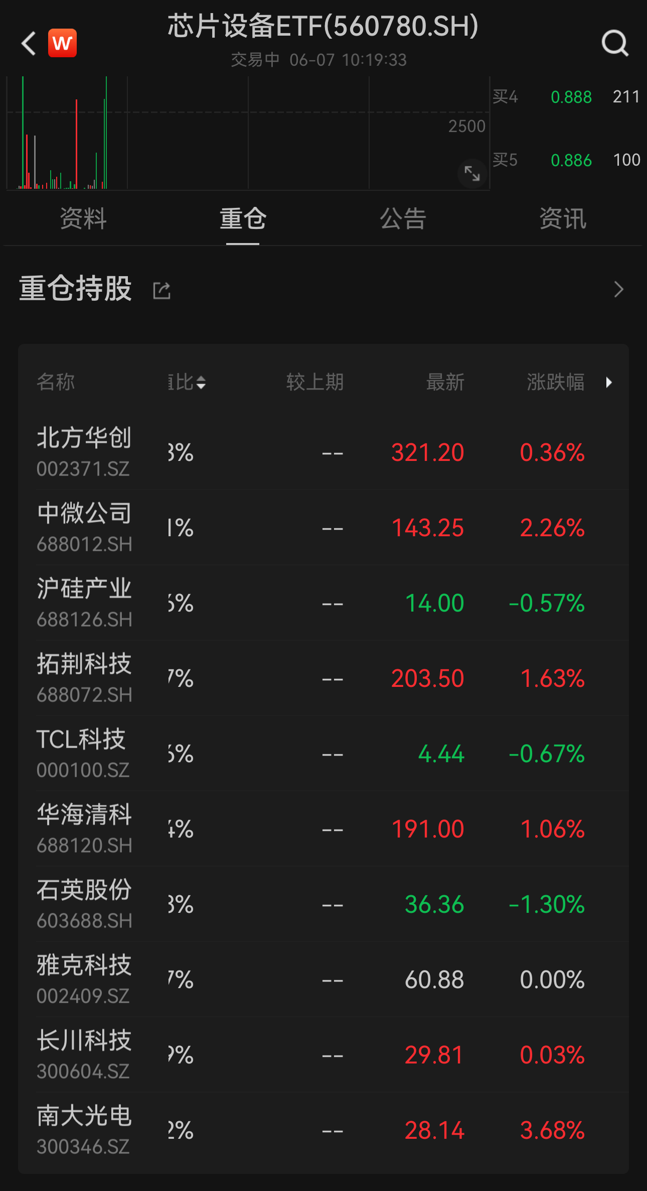 该基金前十大权重股多数上涨,南大光电涨超3%,拓荆科技、中微公司、华海清科、北方华创等个股跟涨。