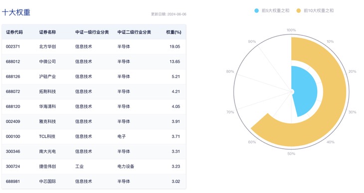 截至2024年6月6日,该指数前十大权重股(包括中微公司、北方华创、沪硅产业、拓荆科技、华海清科等)占比之和达61.14%。(数据来源:中证指数公司,指数成份股不代表个股推荐)
