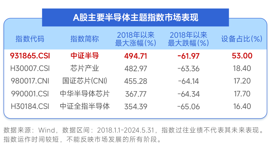 半导体行业具备强周期性,在2019年3季度之前的一轮半导体上行周期区间,聚焦上游设备材料的中证半导指数区间最大涨幅超494%,高于主流半导体全产业链指数,呈现更高弹性特征。