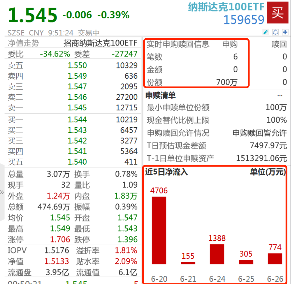 热门ETF方面,跟踪纳斯达克100指数的纳斯达克100ETF(159659)早盘跌0.39%,行情数据显示,盘中获得净申购700万份,合计资金净流入超1000万元;截至昨日,纳斯达克100ETF(159659)已连续5日实现资金净流入,累计流入金额7328万元,近10日资金合计净流入1.2亿元。