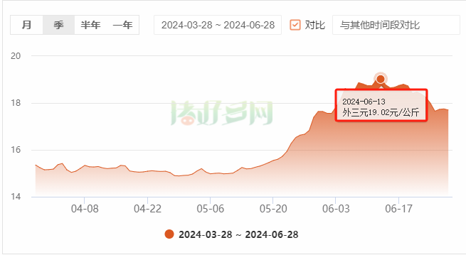 据猪好多数据监测显示,目前年内最高价出现在6月13日,全国外三元生猪出栏均价达到了19.02元/公斤,部分省份突破每斤10元大关;但仅两周时间,外三元生猪均价下跌了1.32元/公斤,截至今日(6月28日),全国外三元生猪出栏均价降至17.70元/公斤,跌幅在6.94%。