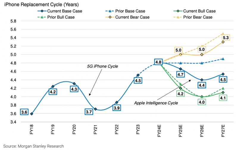 此外,报告还乐观预测,随着iPhone16系列计划在今年晚些时候面世,这一系列新品将有效满足市场上长期累积的购买需求,预示着从2025财年开始,苹果可能迎来一个新的、为期多年的设备更新周期。25财年的iPhone更新周期将缩短0.1年至4.7年,26财年将再缩短0.3年至4.4年。