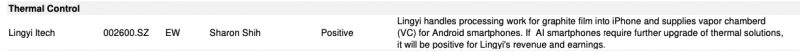 研报指出,领益智造负责向iPhone提供石墨膜的制造工艺,并为安卓智能手机提供VC均热板。如果AI Phone需要进一步升级散热解决方案,这将对领益智造的收入和盈利产生积极影响。