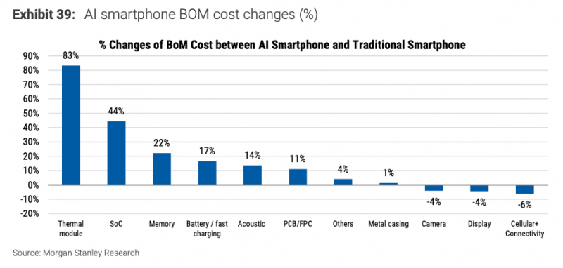 相较于传统智能手机,AI手机的BoM成本中变化最明显的零部件依次为散热模块(83%)、SoC(44%)、存储(22%)、电池/快充(17%)、PCB/FPC(11%)。