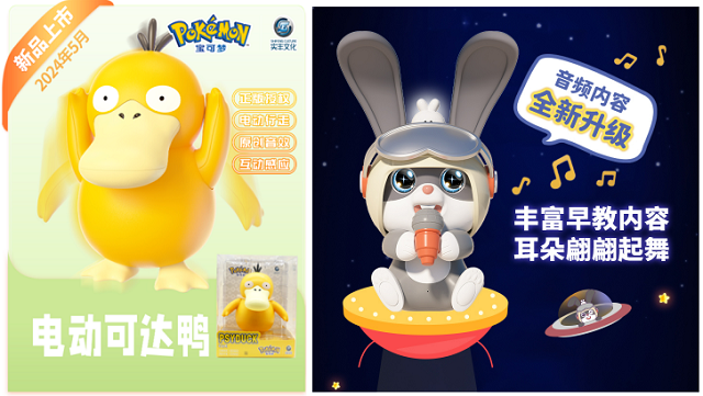 不仅如此,在IP动漫衍生品玩具方面,公司积极与重磅优质IP合作,目前已获得宝可梦、奶龙、贪吃蛇、超级飞侠、蛋仔派对等热门IP授权,公司开发的宝可梦场景套装玩具系列、可达鸭款电动玩具、奶龙款(电动)玩具等广受市场欢迎。2024年5月,公司与奥飞娱乐达成重要战略合作协议,成功取得奥飞娱乐旗下知名IP-超级飞侠智能故事机类目授权。