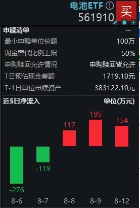 8月13日,两市缩量下探,锂电板块跟随大盘走低,表征板块的电池ETF(561910)跌1.03%逼近前低。然资金热度不减,逆势增仓。截至8月12日,该基金获资金连续3日净流入,累计近500万!