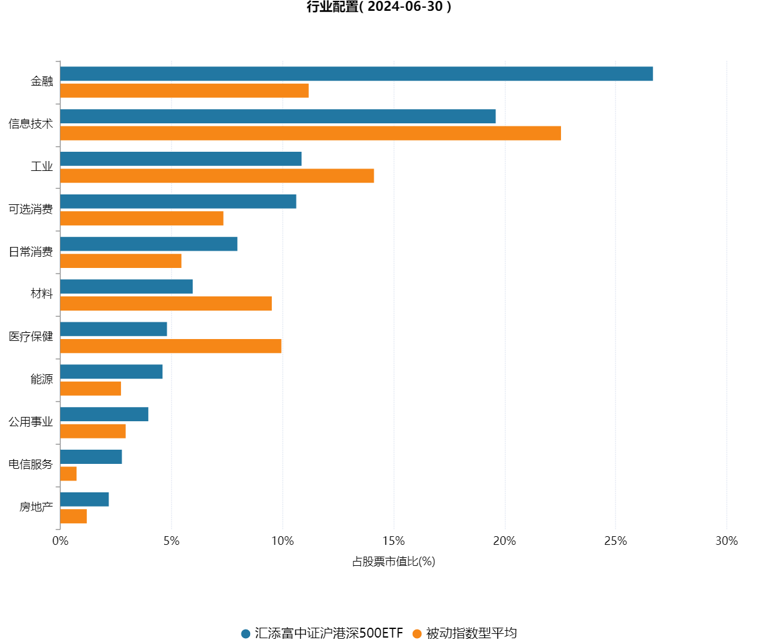 行业配置方面,据2024年中报披露,沪港深500ETF基金(517080)和其标的指数覆盖金融、信息技术、工业等11个行业,其中沪港深500ETF基金(517080)配置金融行业占比最高达26.68%,其次是信息技术(19.6%)和工业(10.86%)。