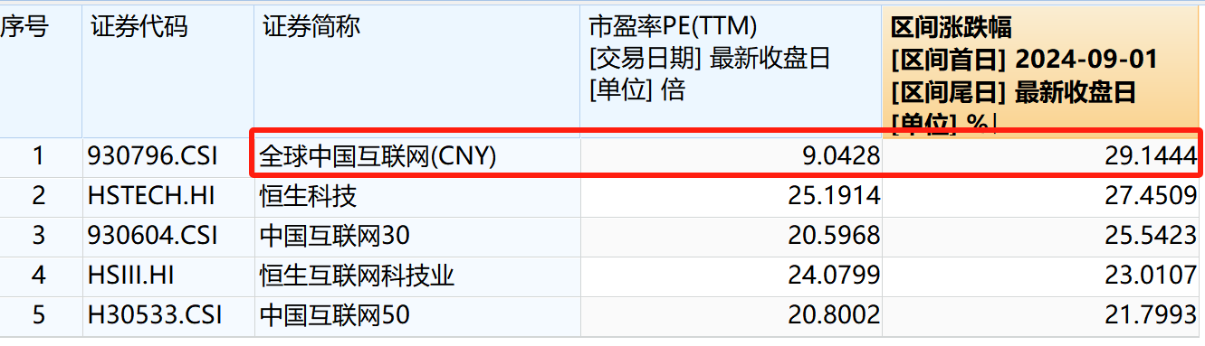 而具体到指数选择上,当前主流的中概互联相关指数中,全球中国互联网的估值仅有9倍,是所有指数里最低的;而从弹性上看,这只指数涵盖了A股和港美股的互联网龙头,自9月以来涨幅达29%,位居同类前列,同期阿里的涨幅只有20%左右,指数相较部分个股的超额明显。